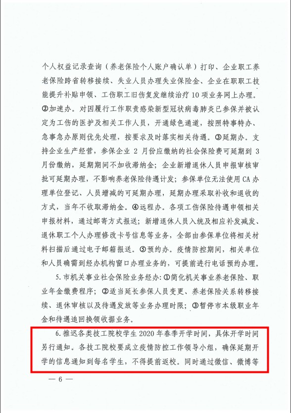 推迟各类技工院校学生2020年春季开学时间,具体开学时间另行通知。各技工院校要成立疫情防控工作领导小组,确保延期开学的信息通知到每名学生,不得提前返校。同时通过微信、微博等各种网络渠道进行假期生活提示,开展健康教育,做好防护引导。