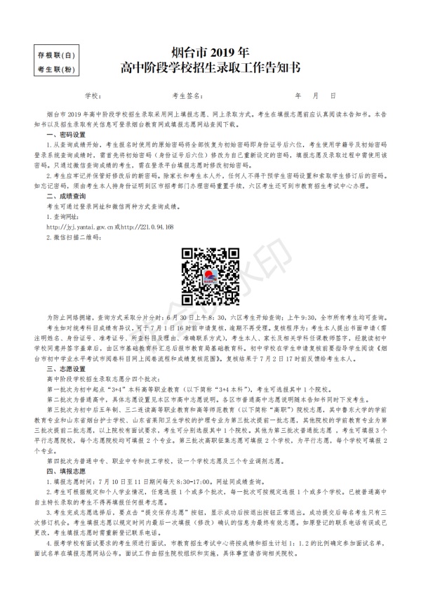 2019年山东烟台中考普通高中招生录取告知书公布了,招生录取时间:7月17日至7月23日。具体内容如下所示: